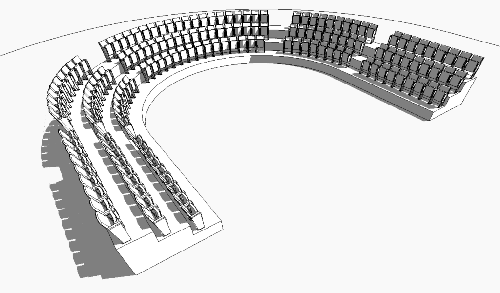 Dans l’exemple qui suit, nous allons illustrer cette approche en exploitant la famille garde-corps pour modéliser des rangées de sièges, dans le cadre de la création d’un amphithéâtre (fig. 2). Plus précisément, nous utiliserons le composant « barreau » de la famille garde-corps, que nous adapterons pour représenter chaque siège de manière paramétrable.