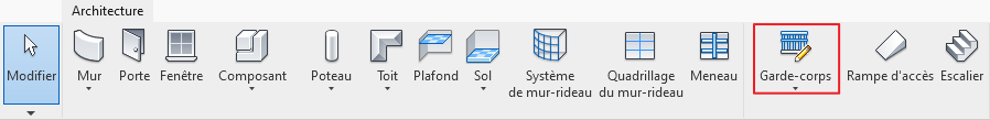 Activez l’outil Garde-corps via l’onglet Architecture du ruban. Une esquisse peut être tracée immédiatement, mais il est recommandé de configurer un type de garde-corps adapté avant de procéder.
