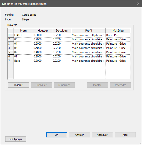 Modélisation de la famille garde-corps de type Sièges