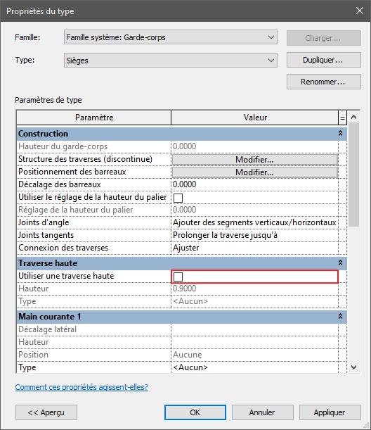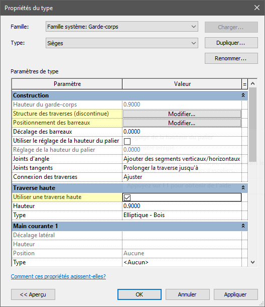 2 . Dans le sélecteur de type, choisissez un type de garde-corps ou conservez le type courant, puis cliquez sur Modifier le type (figure 9). Dupliquez ce type et nommez-le par exemple Sièges pour créer une nouvelle configuration dédiée..