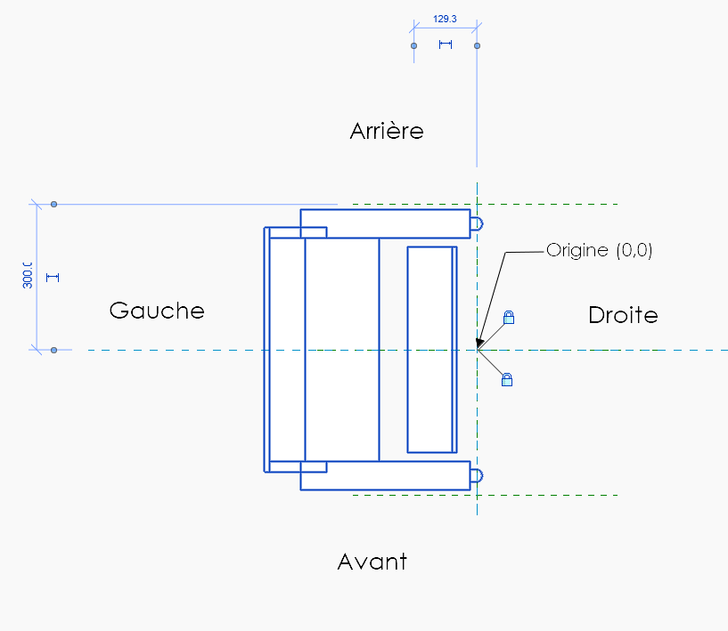 3 . Positionnez la famille importée de façon adéquate : ici, le point milieu de la face droite du siège est aligné sur l’origine de la famille barreau. Cette origine correspond à un point de la trajectoire du garde-corps. L’orientation correcte du composant est essentielle pour assurer son bon positionnement dans la modélisation finale.